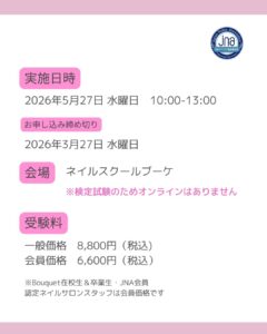 ※Bouquetの在校生&卒業生・JNA会員・認定ネイルサロンスタッフは会員価格で受験できます